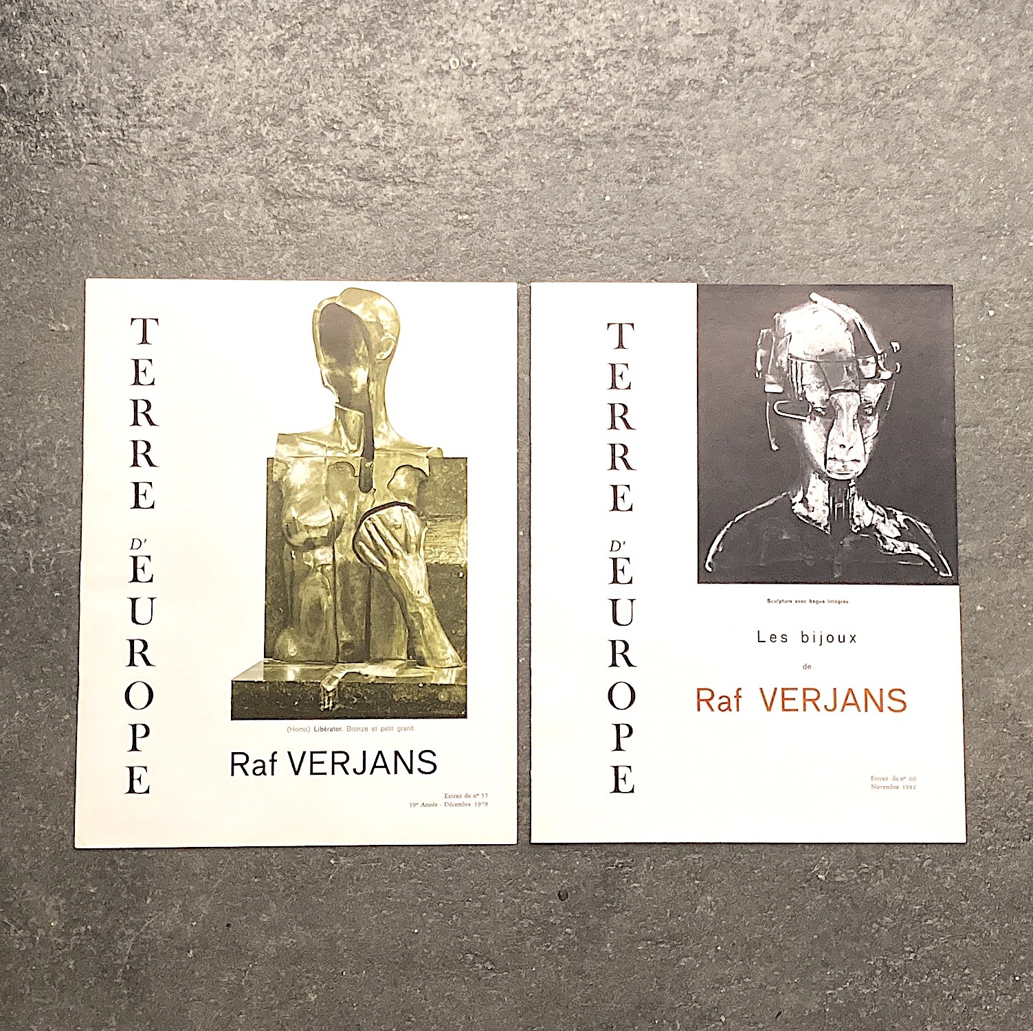 1 catalogus 1979 over homoïde beelden,plus 1 catalogus 1982 over geïntegreerde juweel-sculpturen. Franstalig; in bijlage Nederlandse vertaling. Afmeting: 31×24 cm per deel, 10 blz.