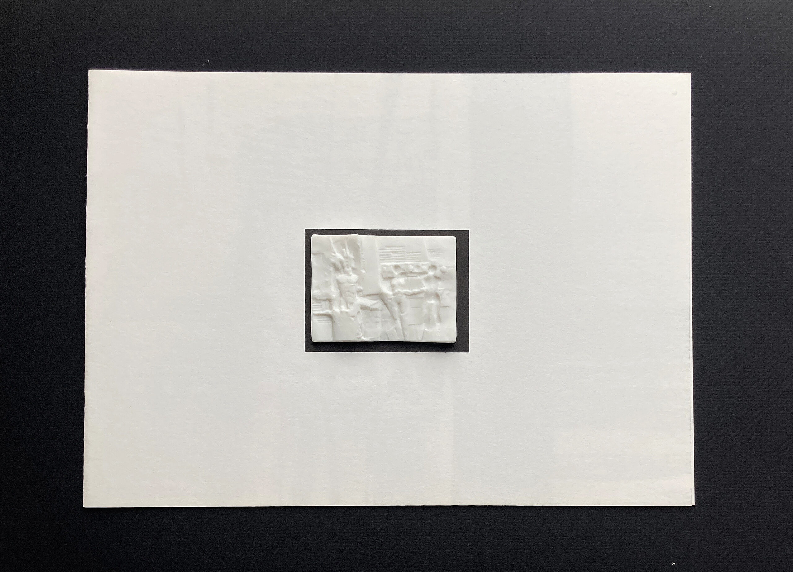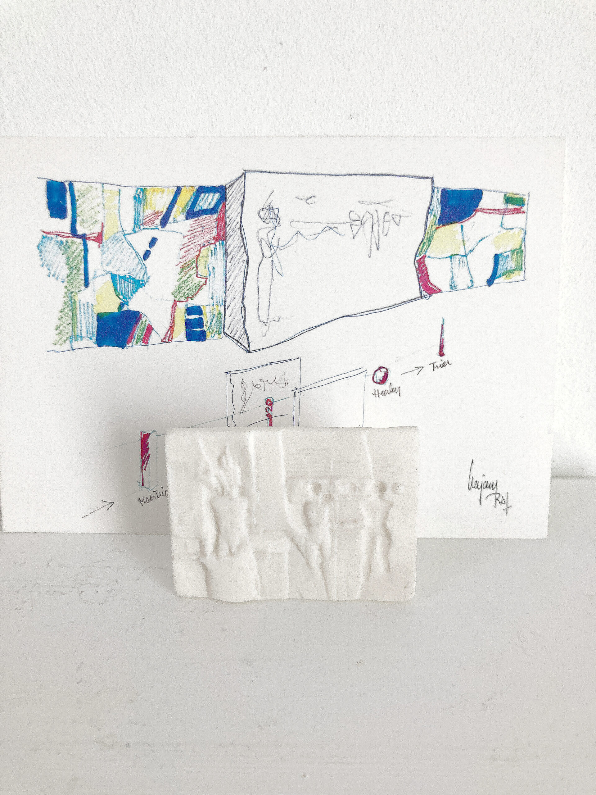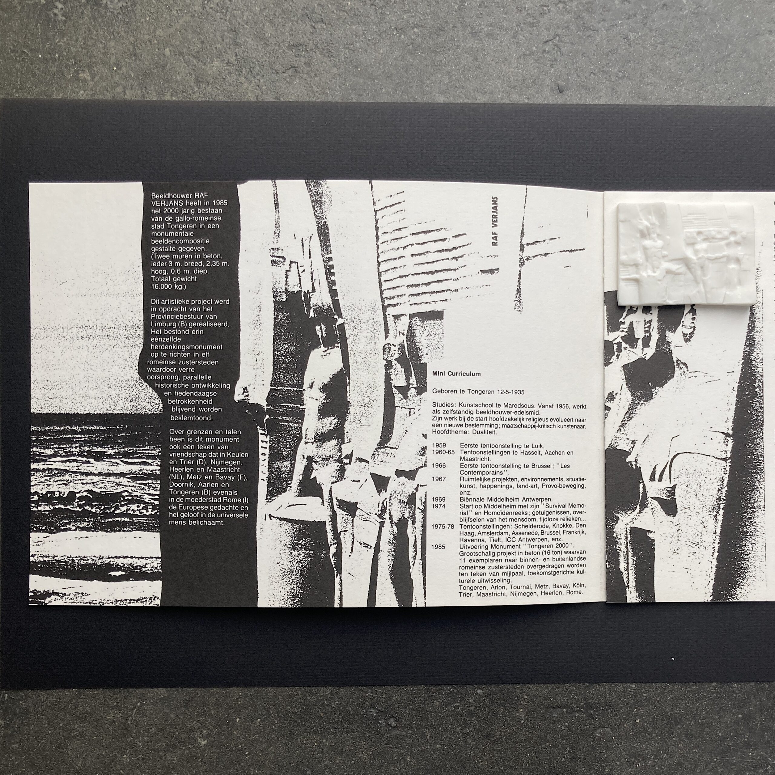 Porseleinen plaket van verkleinde afbeelding van 1 zijde van het ‘DUO monument 2000’ geplaatst in 11 steden (België, Nederland, Frankrijk, Duitsland en Italië) Plaket is afneembaar.